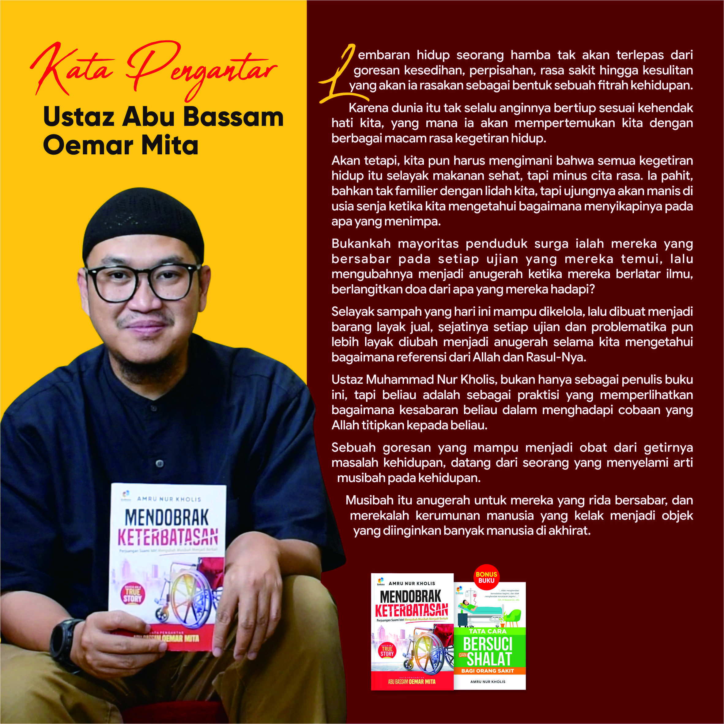 Bagaimana memberikan jawaban terhadap berbagai ujian kehidupan? Itulah yang diuraikan oleh penulis dalam buku ini. Bukan sekadar penjabaran teoritis normatif, akan tetapi penulis menjawabnya dengan pengalaman pribadi penulis yang mengalami kelumpuhan, lalu hidup dengan segala keterbatasan.