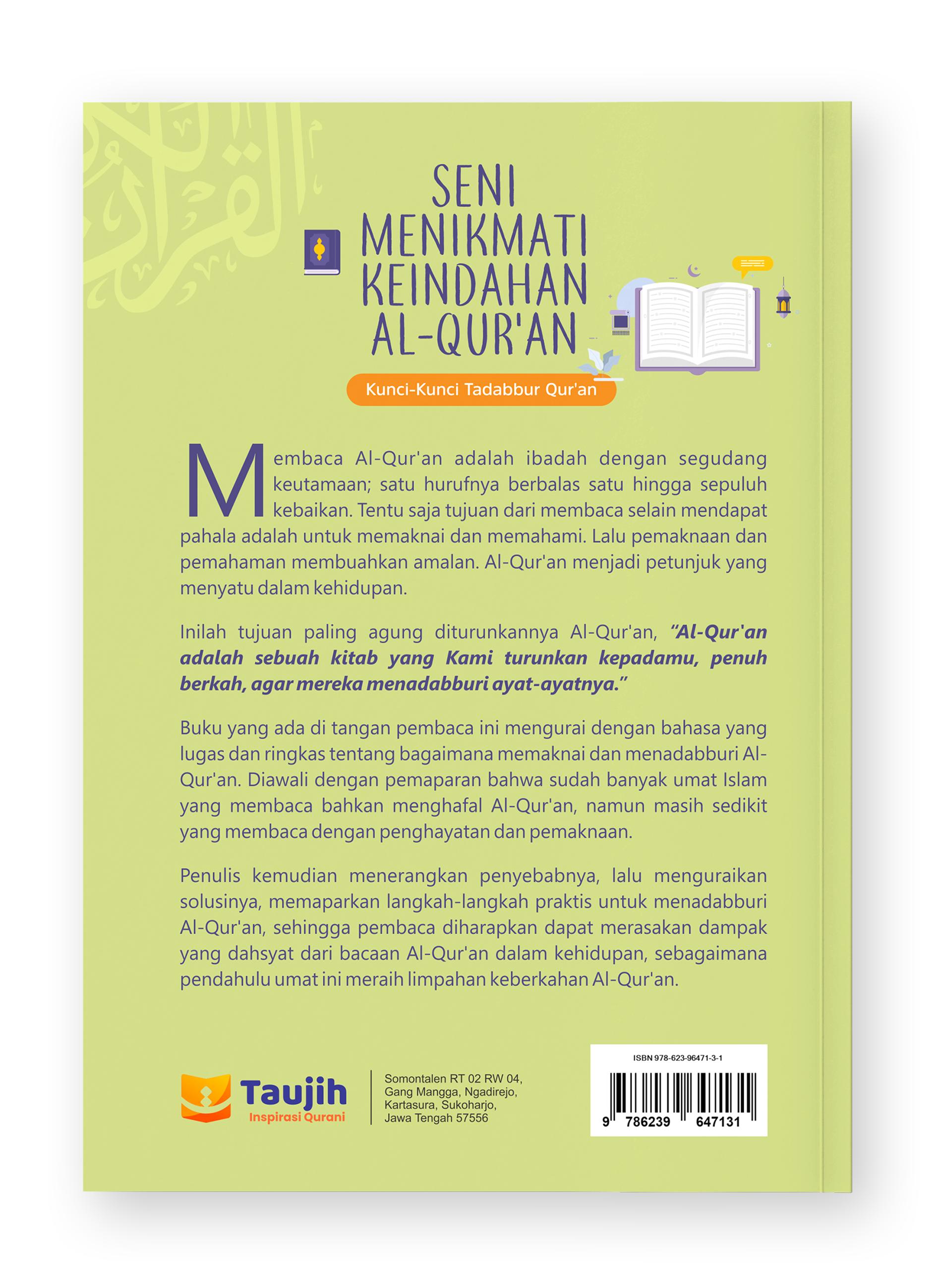 Seni Menikmati Keindahan Al-Qur’an, akan memandu Anda untuk bisa meningkatkan kualitas interaksi Anda dengan Al-Qur’an dari level membaca kepada level meresapi dan memaknai. Disertai langkah-langkah praktis dan contoh aplikatif sehingga mudah dimengerti.